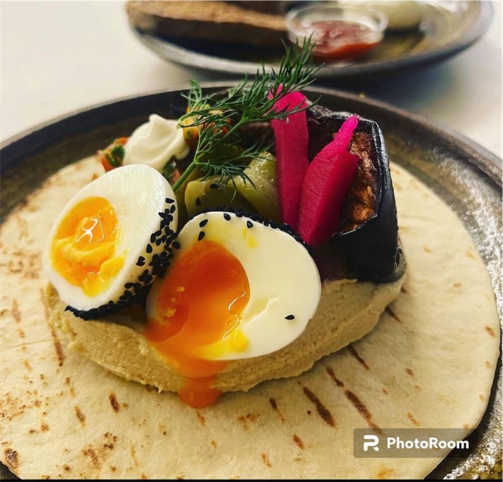 Spiced Eggplant, Hummus, Soft Boiled Egg, Tahini Yoghurt, tomato & Pickles Flat Bread