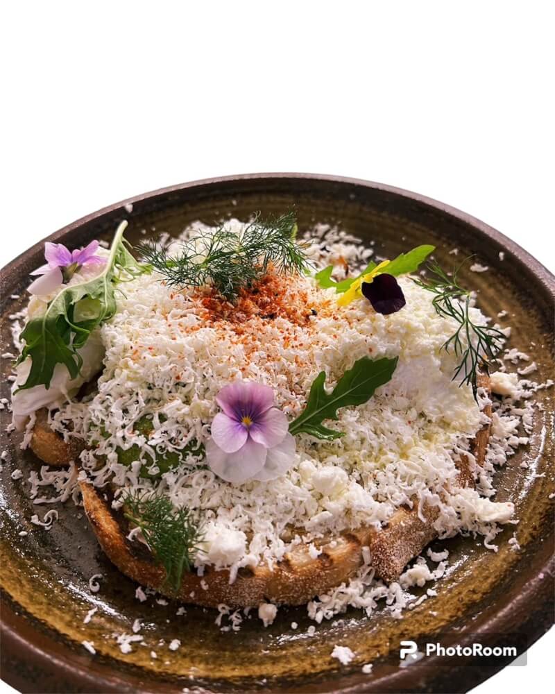 Poached Eggs, Avocado, Feta cheese served on Sourdough sprinkled with Togarashi. (spice)