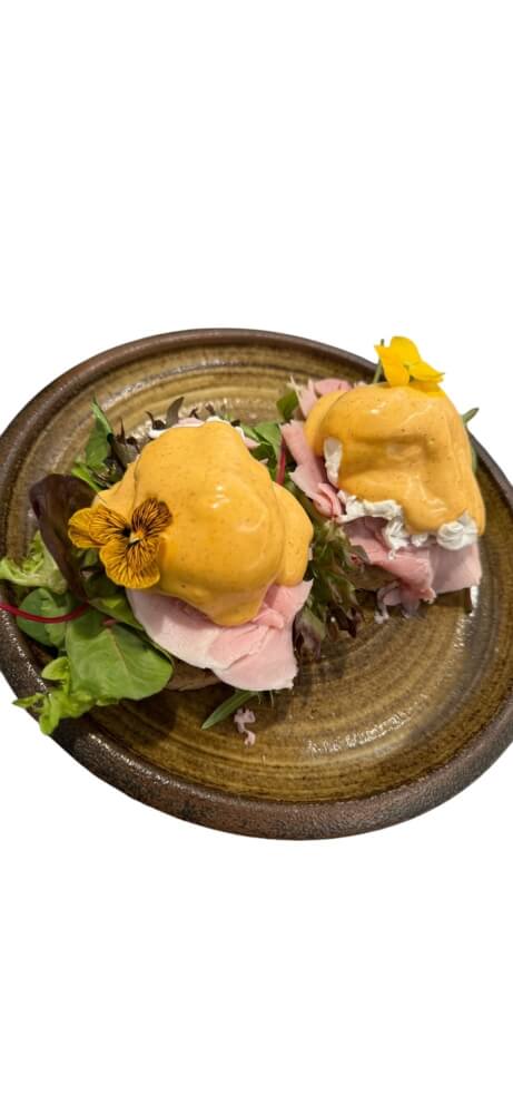 Poached eggs served on a soft croissants with fresh green leaves and savory ham,topped with a spicy hollandaise sauce